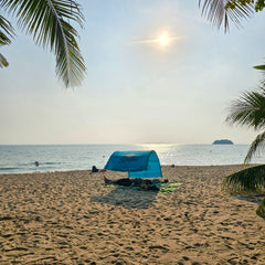 Woman in colourful dress carrying a packed Suniela beach tent while looking out at Thai islands in the sunset_printTurquoiseSuniela